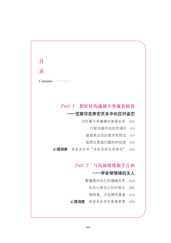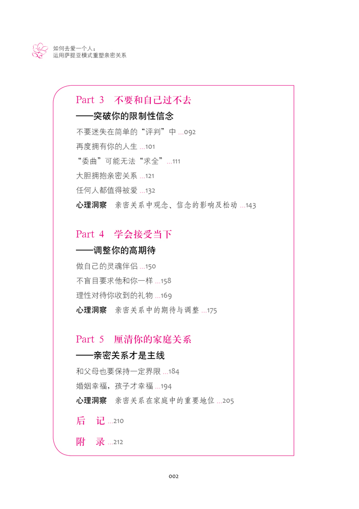 幸福家庭是幸福国家的基石。幸福的家庭依赖于和谐的婚姻关系。这还是一本关于萨提亚模式的心理学书籍,理论基础是萨提亚模式的“冰山”隐喻。作者把理论融合在故事中,并加入了智慧的洞见,又以解读的方式清晰地呈现出来。普通读者即使不了解理论知识,也可以在阅读故事中轻松做到对自己和关系的觉察,从而做出改变;专业读者则能通过这些故事和后面的解读更加了解“冰山”隐喻的应用。