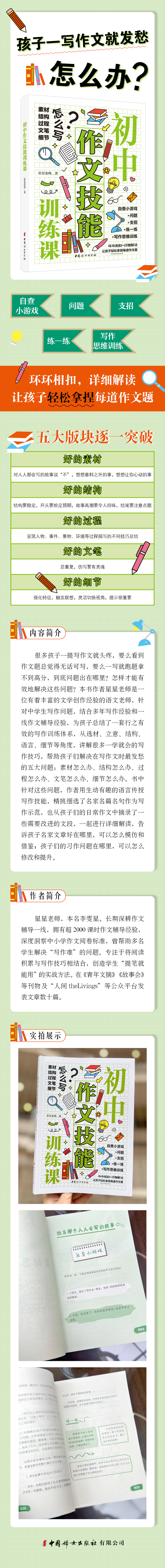 很多孩子一提写作文就头疼,要么看到作文题总觉得无话可写,要么一写就跑题拿不到高分,到底问题出在哪里?怎样才能有效地解决这些问题?本书作者星星老师是一位有着丰富的文学创作经验的语文老师,针对中学生写作问题,结合多年写作经验和一线作文辅导经验,为孩子总结了一套行之有效的写作训练体系,从选材、立意、结构、语言、细节等角度,通过一学就会的写作技巧帮助孩子们解决在写作文时最发愁的五大问题:素材怎么办、结构怎么办、过程怎么办、文笔怎么办、细节怎么办。书中针对这些问题,作者用生动有趣的语言传授写作技能,精挑细选了名家名篇名句作为写作示范,也从孩子们的日常作文中摘录了一些需要改进的文段,一起进行详细解读,告诉孩子名家文章好在哪里,可以怎么模仿和借鉴;孩子们的习作问题在哪里,可以怎么修改和提升。