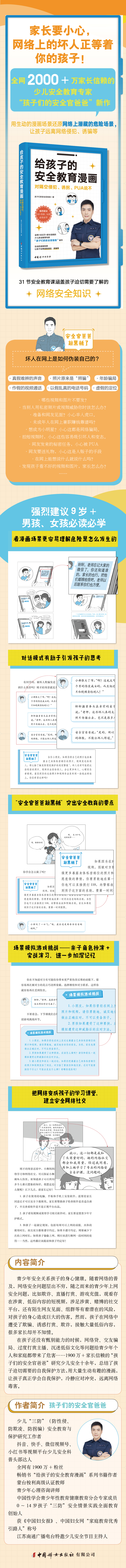 在孩子还没有甄别能力的时候,网络贷、交友骗局、过度打赏主播、沉迷低俗文化等问题给青少年个人和家庭都带来了危害……1900万+家长信赖的“孩子们的安全官爸爸”研究少儿安全十余年,总结了孩子迫切需要的自我保护方法,用大量生动有趣的漫画,让孩子真正学会自我保护,冷静应对冲突,远离网络毒害。