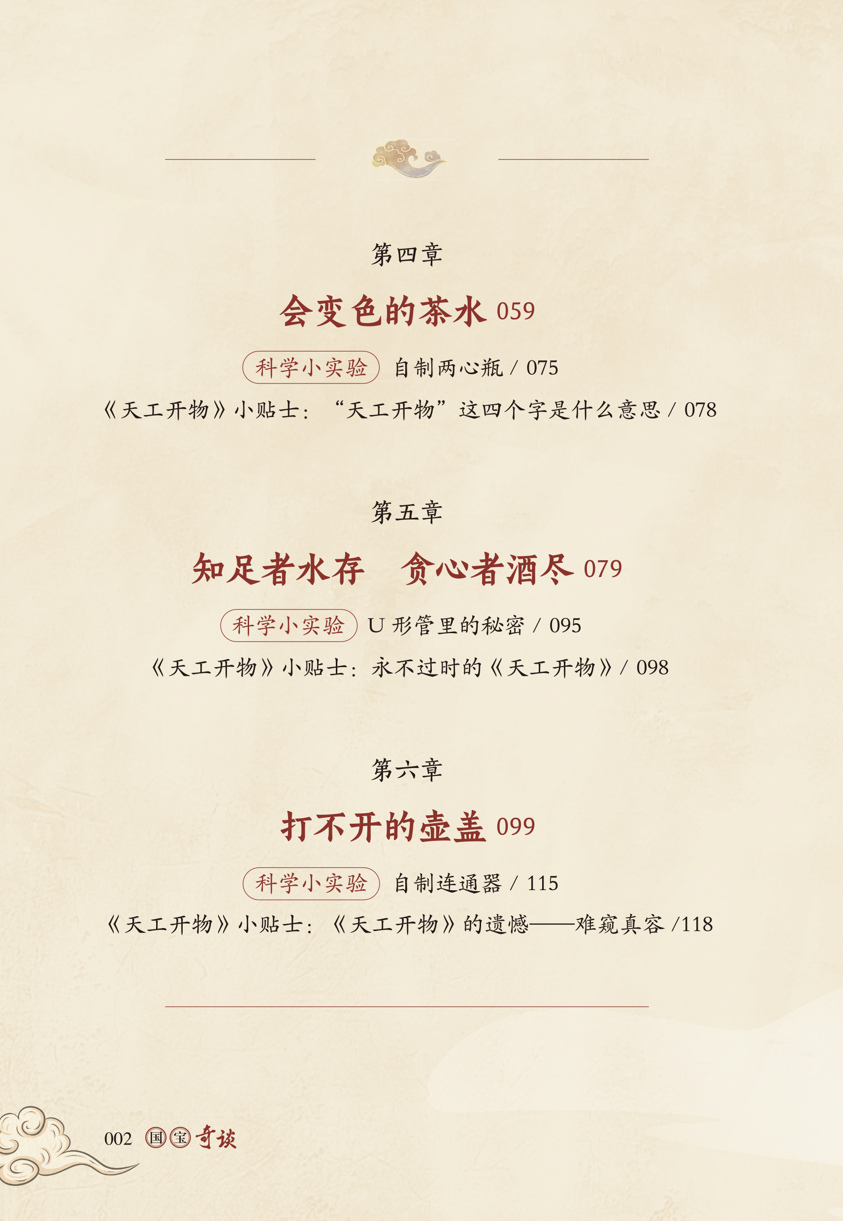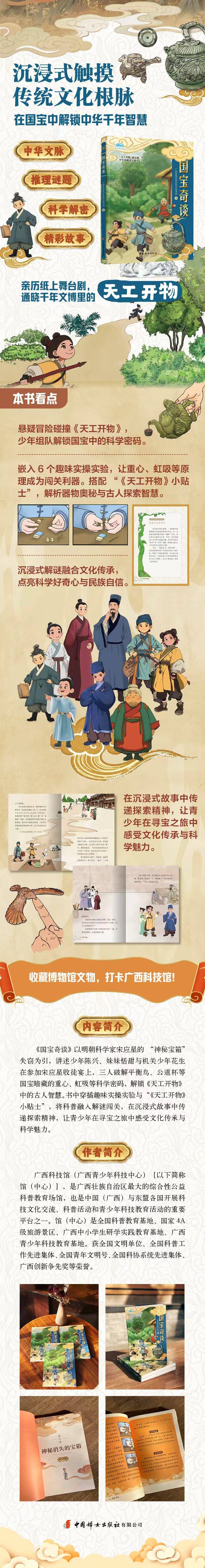《国宝奇谈》以明朝科学家宋应星的 “神秘宝箱” 失窃为引,讲述少年陈兴、妹妹恬甜与机关少年花生在参加宋应星收徒宴上,三人破解平衡鸟、公道杯等国宝暗藏的重心、虹吸等科学密码,解锁《天工开物》中的古人智慧。书中穿插趣味实操实验与 “天工开物小贴士”,将科普融入解谜闯关,在沉浸式故事中传递探索精神,让青少年在寻宝之旅中感受文化传承与科学魅力。