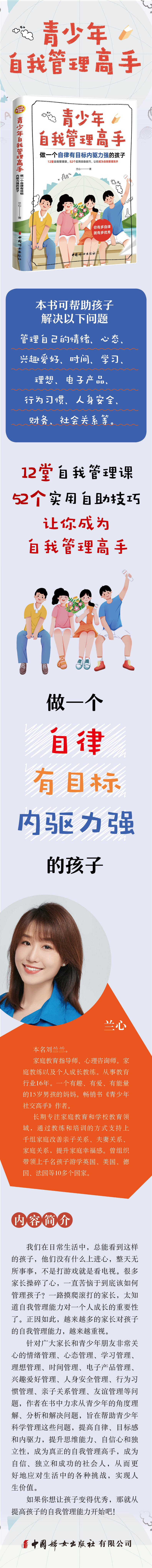 本书可帮助孩子管理自己的情绪、心态、兴趣爱好、时间、学习、理想、电子产品、行为习惯、人身安全、财务、社会关系等,从而成为一个自律有目标内驱力强的人。