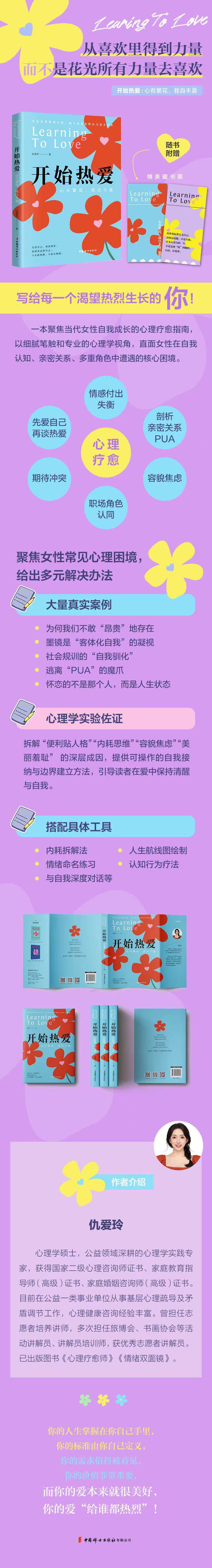 《开始热爱:心有繁花,我自丰盈》是一本聚焦当代女性自我成长的心理疗愈指南,作者仇爱玲以细腻的笔触和专业的心理学视角,直面女性在自我认知、亲密关系、多重角色中遭遇的核心困境。